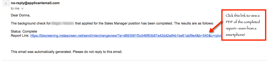 The email contains a PDF link to the completed report, which is convenient for viewing the report on a mobile device or tablet.