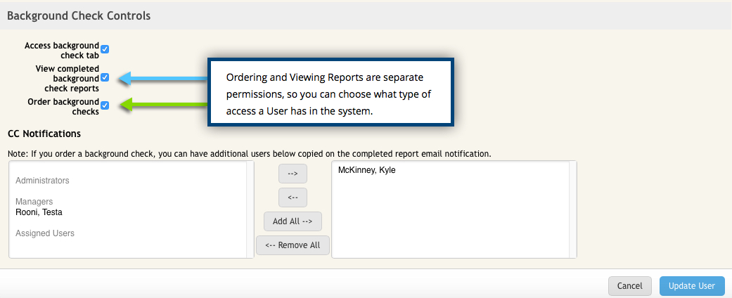Users who have access to the ATS system will never by default have access to view or run Background Checks. When we set you up we will give rights only to you, and you will grant other users access if you choose.