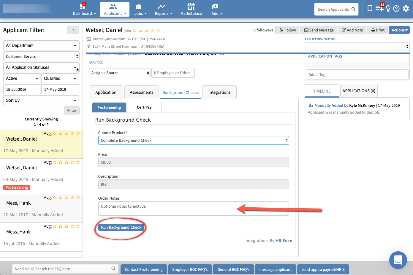 Each package will include a description. You can add any optional notes for the order. Click 'Run Background Check'.'