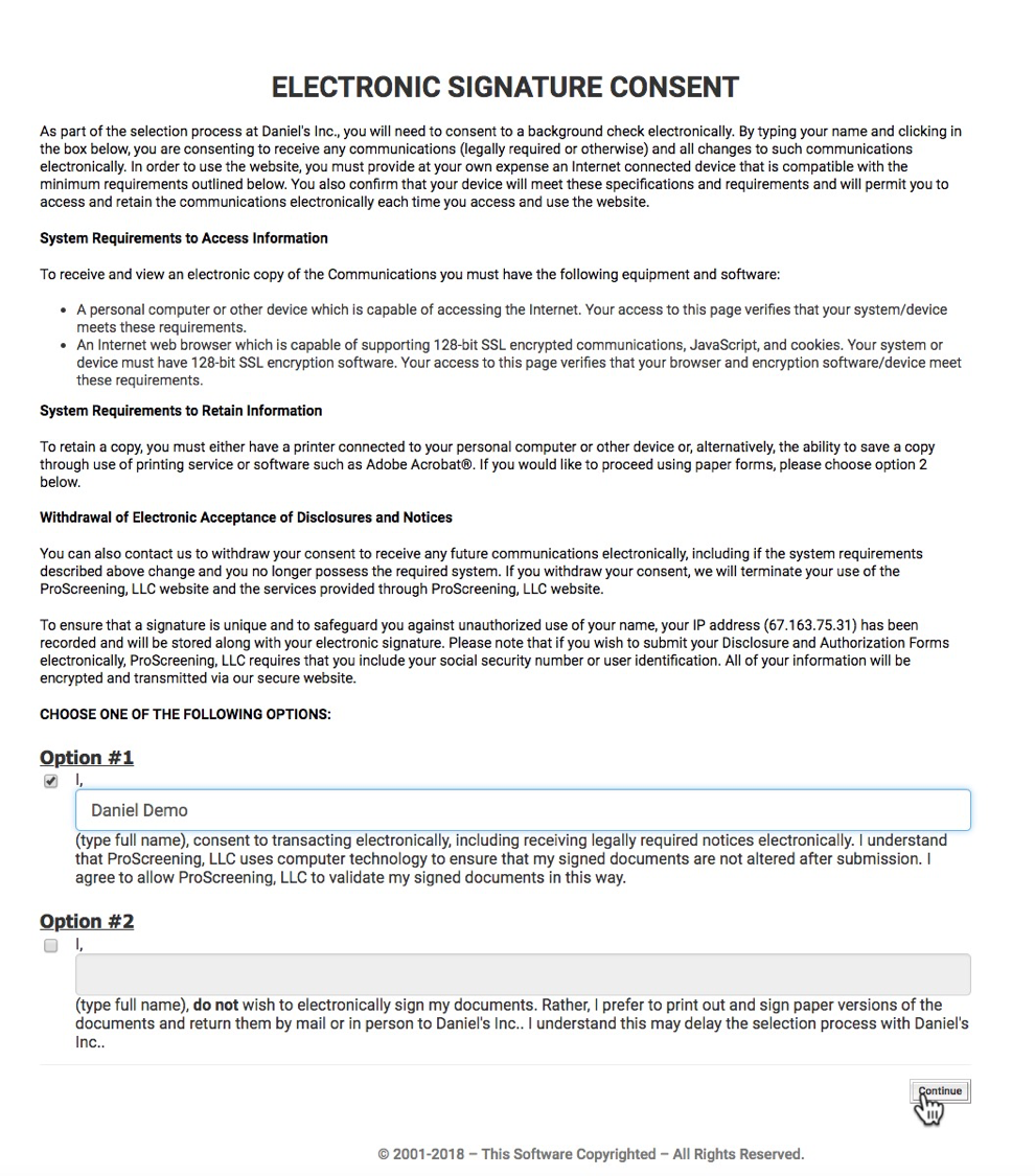 The applicant is asked to consent to signing the background check forms electronically